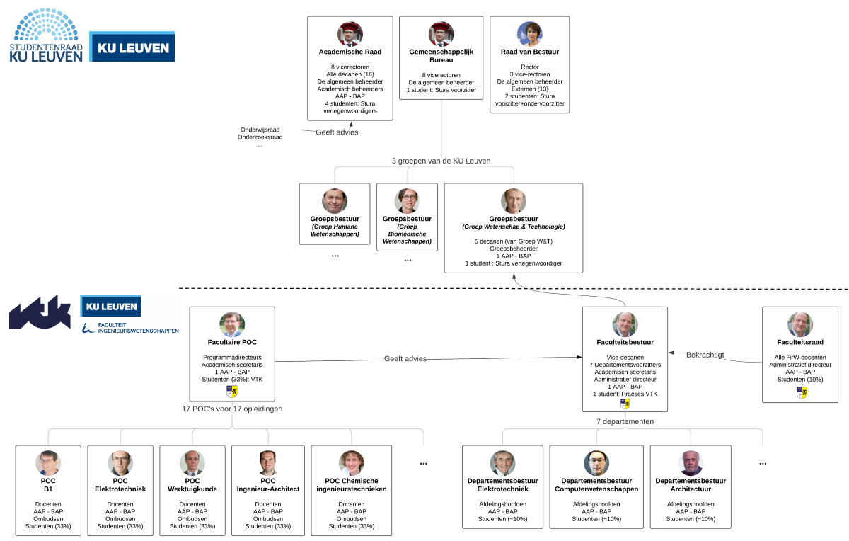 Onze decaan zetelt samen met de 4 andere decanen (die deel uitmaken van de Groep W&T) in het groepsbestuur van de Groep W&T. Deze wordt voorgezeten door de vicerector van de groep W&T. In het groepsbestuur wordt de studentenstem gebracht door een vertegenwoordiger van de Studentenraad KU Leuven (afgekort ‘Stura’). Hoe deze vertegenwoordiger wordt gekozen, wordt verder uitgelegd.